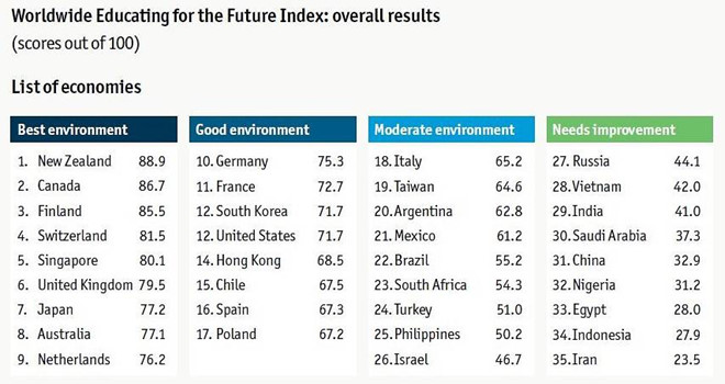 - Đội ngũ giáo viên chất lượng: EIU nhận định lợi thế của giáo dục nước này đến từ đội ngũ giáo viên chất lượng cao, tập trung việc cung cấp cho học sinh, sinh viên những kỹ năng cần thiết để thành công trong sự nghiệp tương la